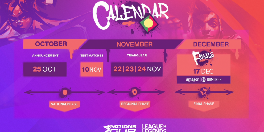 As modalidades partilham a primeira data para os jogos da fase nacional, ou jogos de teste, o dia 10 de novembro. Na fase regional, a competição terá datas diferentes para League of Legends e VALORANT, com o primeiro a decorrer entre os dias 22 e 24 de novembro e o segundo a decorrer entre os dias 29 de novembro e 1 de dezembro.