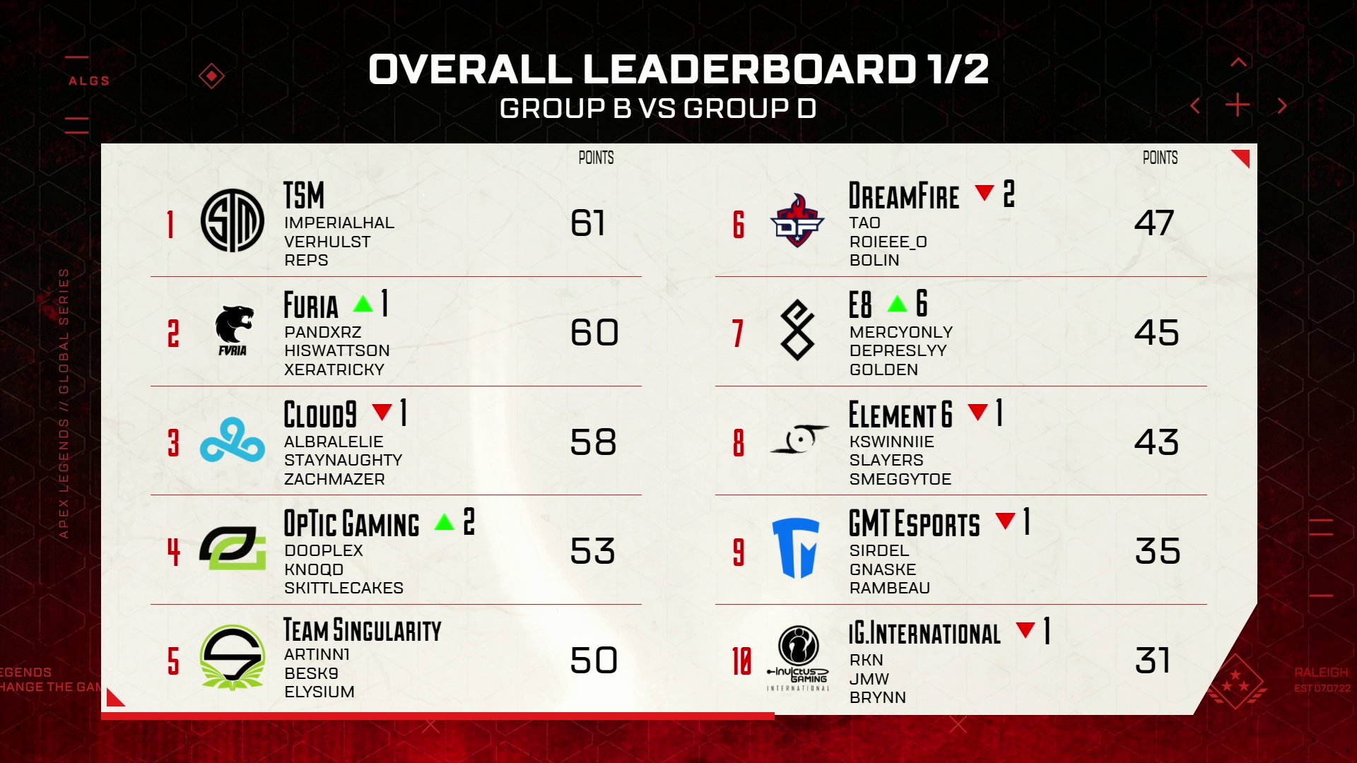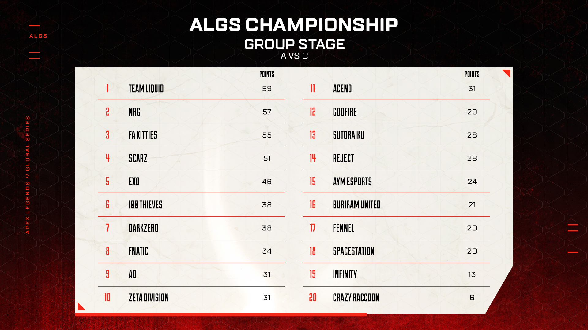 ⭐️40 team Leaderboard after the first group matchup #ALGS Year 2 Championship pic.twitter.com/10XurIQsmR