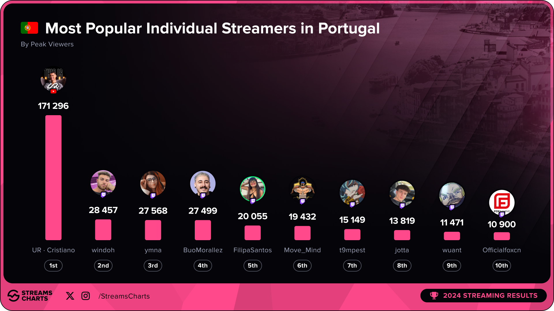 Quando trocamos o indicador por pico de espectadores, o caso muda de figura e Cristiano Ronaldo é líder incontestado com um pico de mais de 171 mil espectadores em simultâneo na sua transmissão no YouTube com MrBeast. O restante top 10 pertence a criadores da Twitch e conta com windoh, ymna, BuoMorallez e FilipaSantos a fechar o top 5.