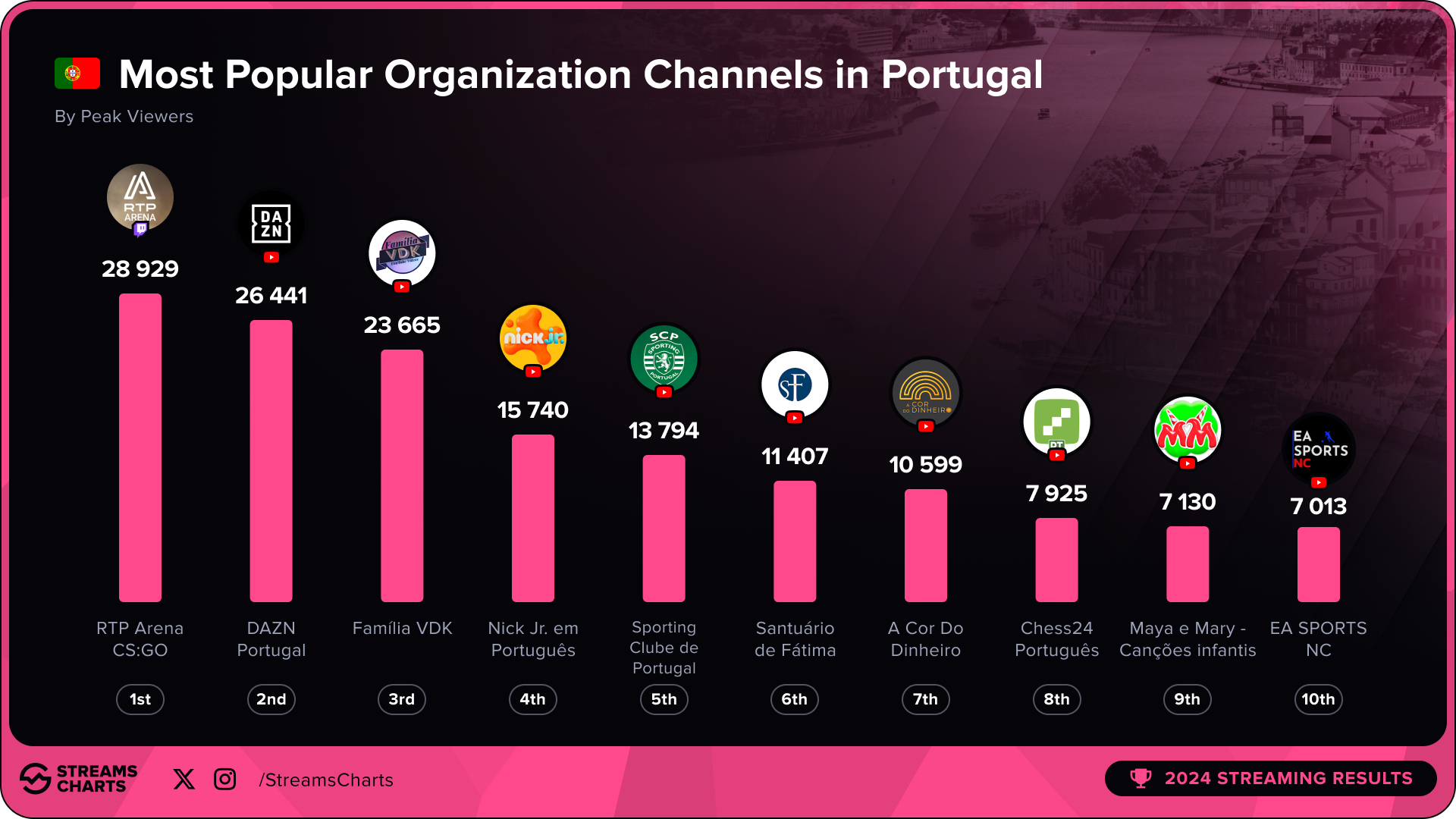 Quanto a pico de espectadores, a RTP Arena CS:GO leva a coroa, com um pico de quase 29 mil espectadores, ao que se segue a DAZN Portugal, Família VDK, Nick Jr Em Português e Sporting Clube de Portugal. O canal dedicado a competições e conteúdo de CS da RTP Arena é o único canal da Twitch nesta lista dominada pelo YouTube.