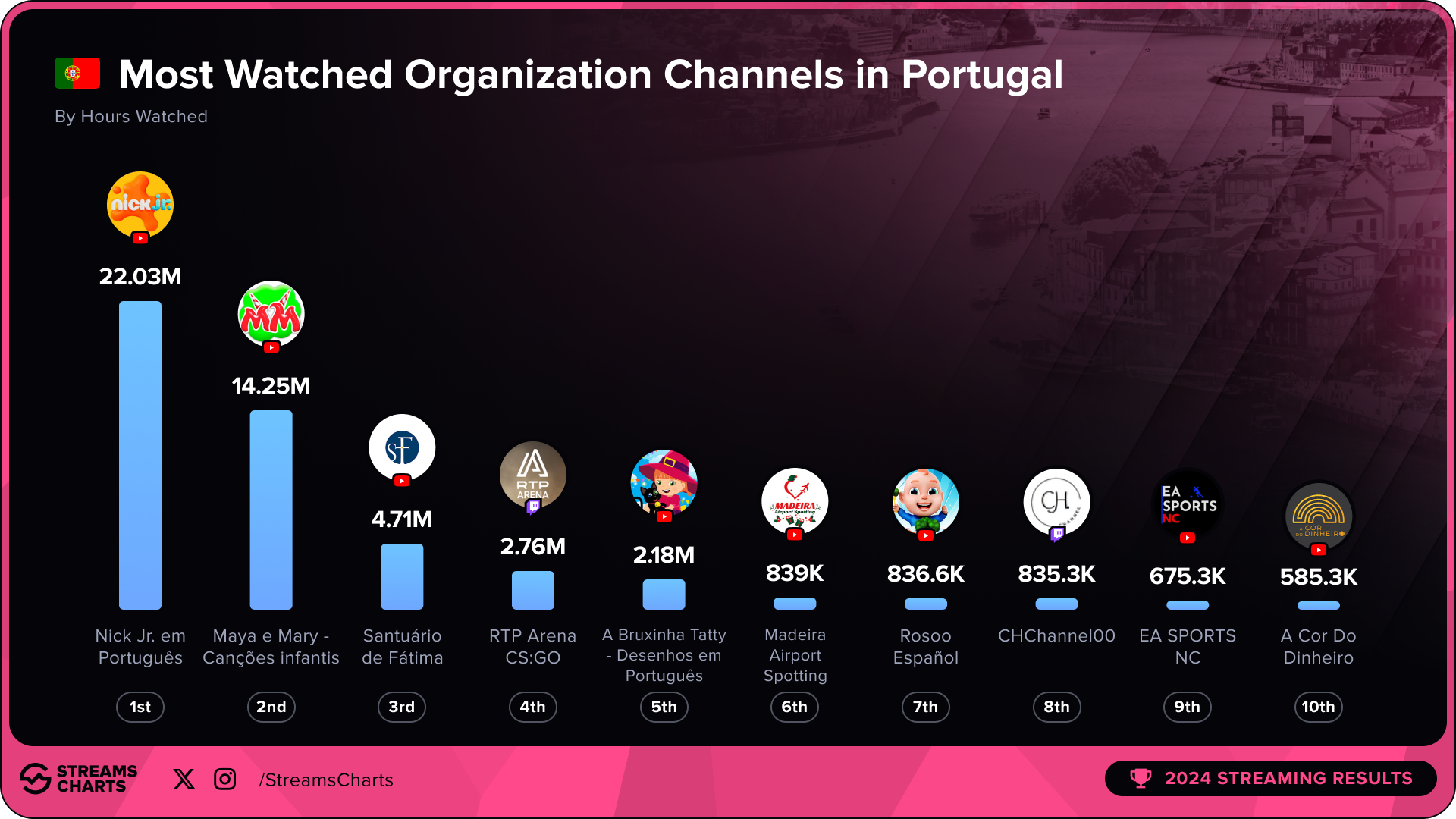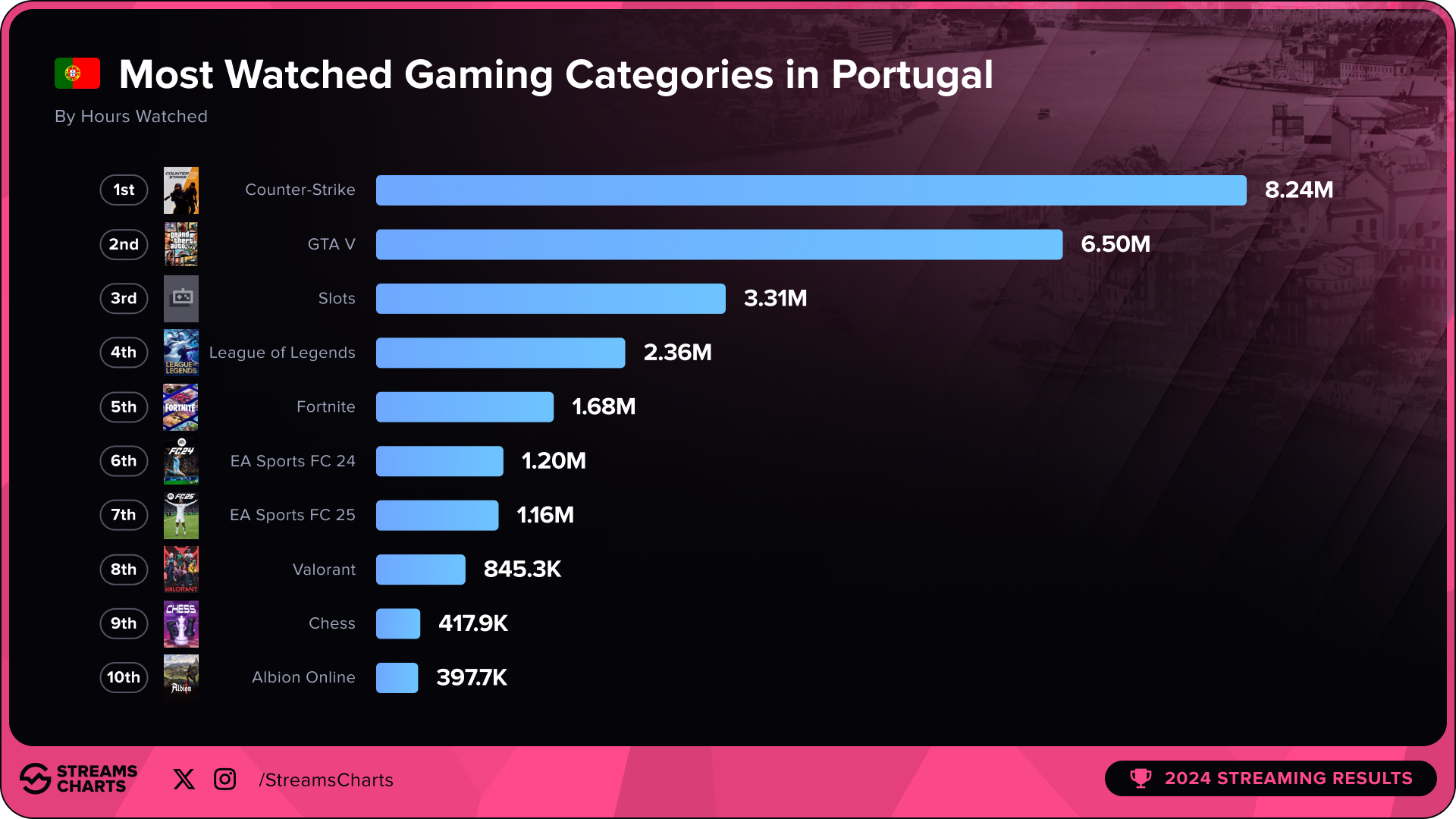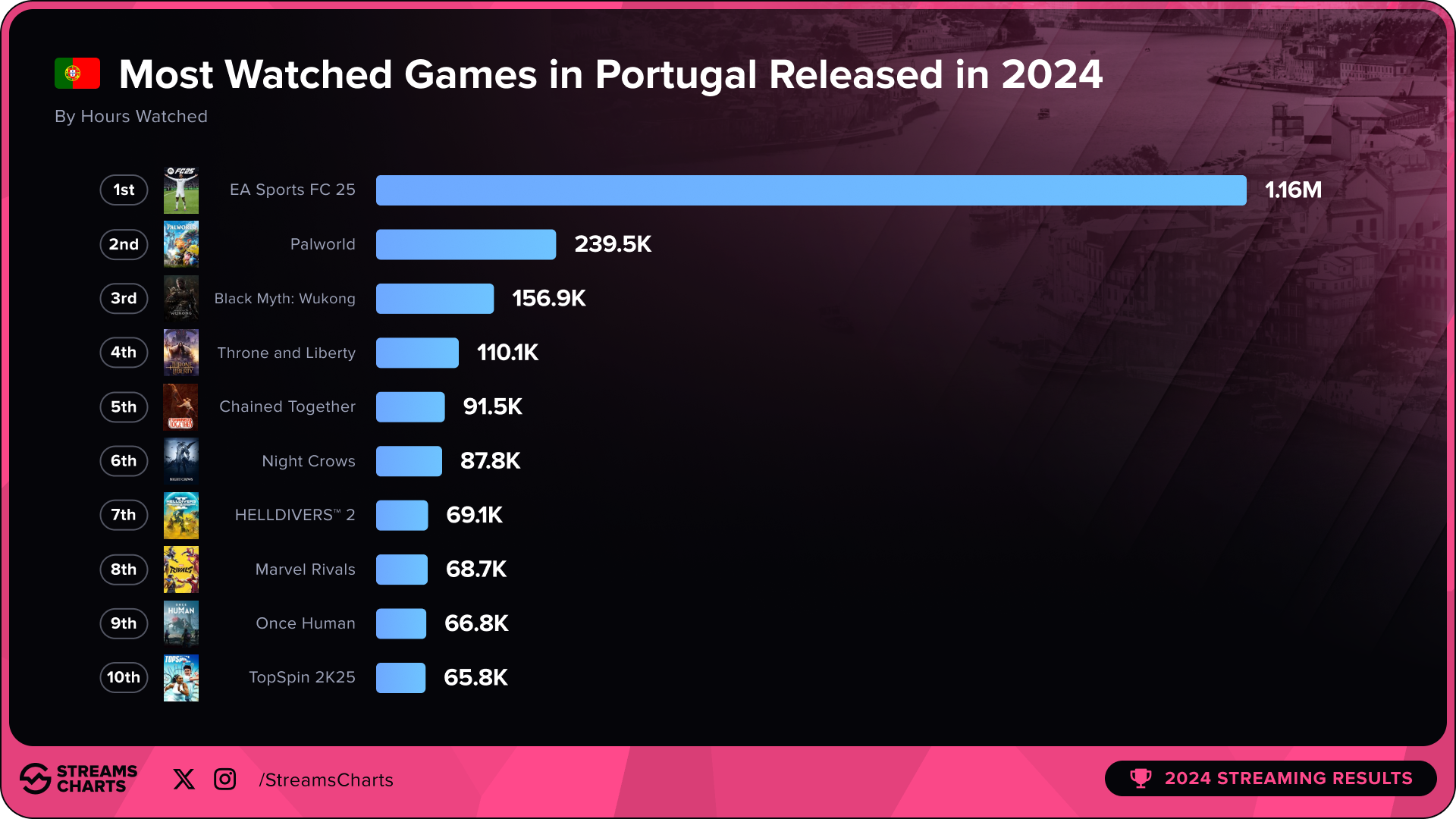 Os números que vais encontrar em baixo são relativos aos espectadores de uma audiência global (não sendo possível à plataforma Streams Charts conhecer a localização de todos os espectadores por categoria), mas relativos a transmissões feitas por canais e streamers portugueses. A Streams Charts dividiu as categorias por jogos, liderada pelo Counter-Strike 2, jogos lançados em 2024, liderada pelo EA FC 25, e temas não-gaming, onde o entretenimento e Just Chatting reinaram.