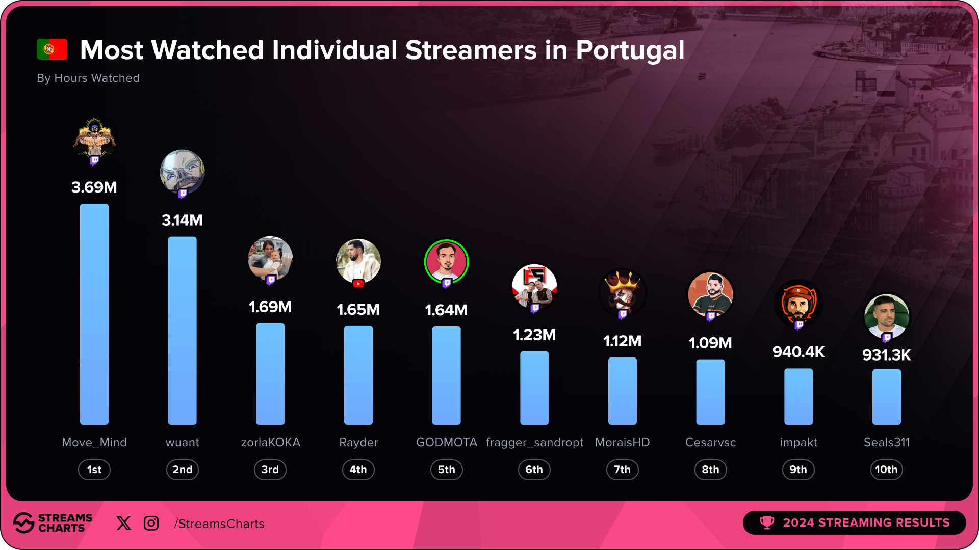 No que toca a transmissões realizadas por streamers individuais, isto é, criadores de conteúdo com canal próprio e não empresas ou organizações, Move_Mind foi mais uma vez o líder incontestado na Twitch, no que toca a horas vistas, subindo além dos 3,68 milhões. Wuant, com quem o criador fechou uma transmissão especial ao longo de dezembro, seguiu na segunda posição com um total de 3,14 milhões (os números não refletem a totalidade do mês de dezembro).