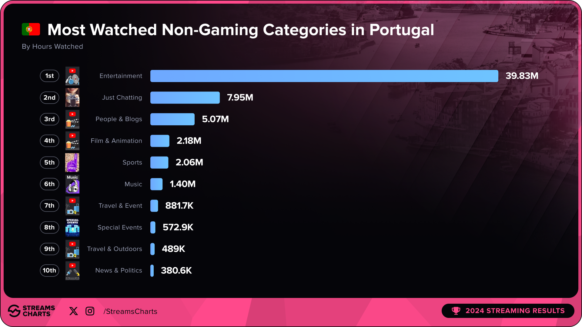 Os gráficos confirmam as tendências observadas pelo Nazar Babenko com o número de horas vistas de Entretenimento no YouTube (39,83 milhões) a eclipsar por completo o número de horas vistas do jogo mais assistido em Portugal, Counter-Strike 2 (8,24 milhões). A categoria Just Chatting na Twitch também esteve perto de alcançar o CS, com 7,95 milhões de horas vistas ao longo do ano. Outras categorias como Desporto, Filmes, Música e Blogs também rivalizaram com os jogos mais vistos do ano.