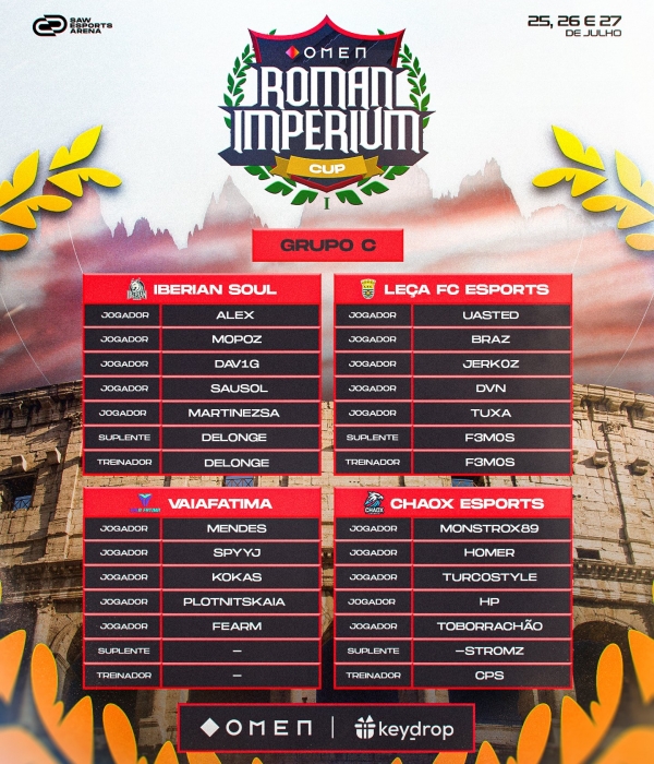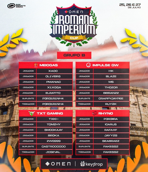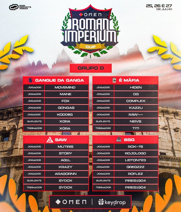 Com entrada gratuita na SAW Esports Arena para todos os interessados em assistir ao vivo, a OMEN ROMAN IMPERIUM CUP I também conta com transmissão na Twitch, proporcionando os seguintes jogos inaugurais: