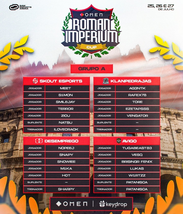 A OMEN ROMAN IMPERIUM CUP 1 estreia esta sexta-feira na SAW Esports Arena, em Gaia, e vai contar com nomes para todos os gostos: MoveMind representará o Gangue da Ganga; NOPEEj e Snapy vão a jogo.