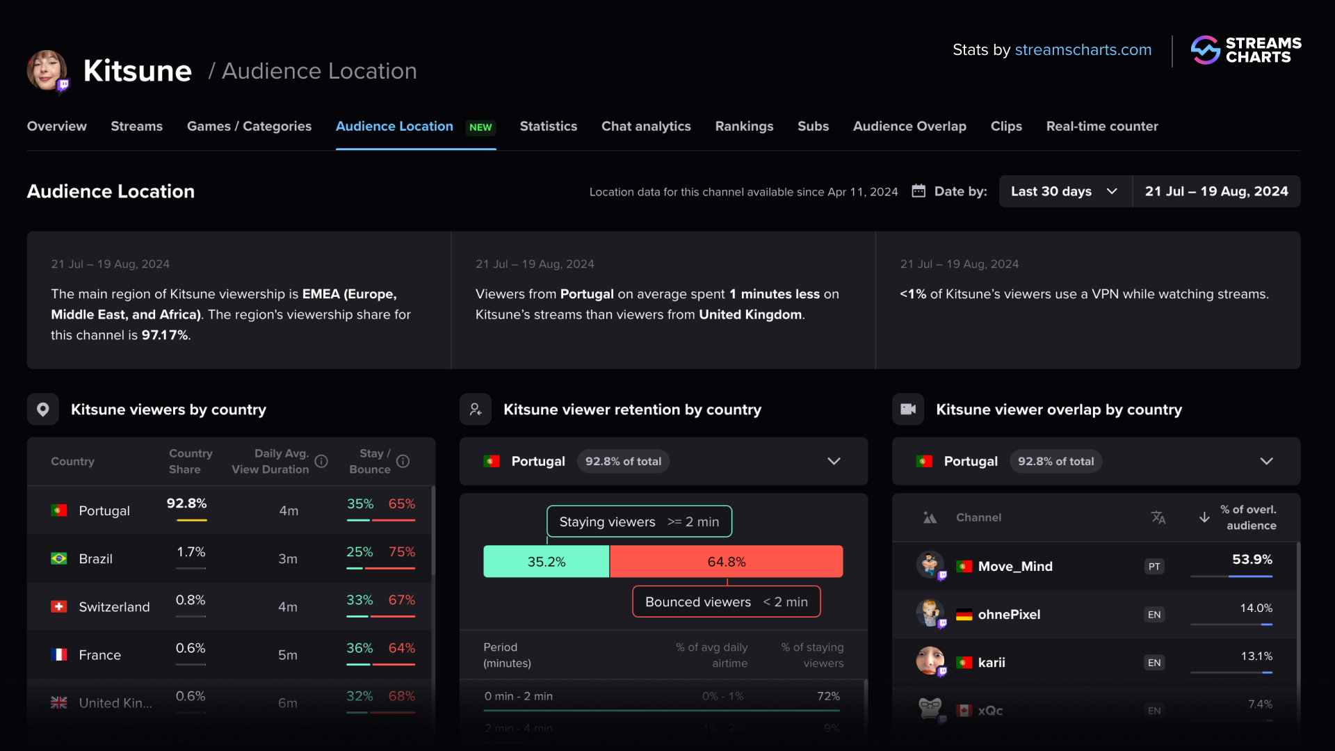 Com recurso à nova ferramenta da plataforma de análise de dados de streamers é possível saber de onde são os espectadores dos criadores de conteúdo, se usam ou não VPN para aceder às transmissões e até qual a taxa de retenção de espectadores por país.