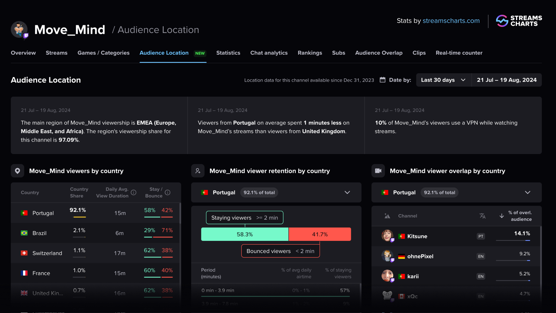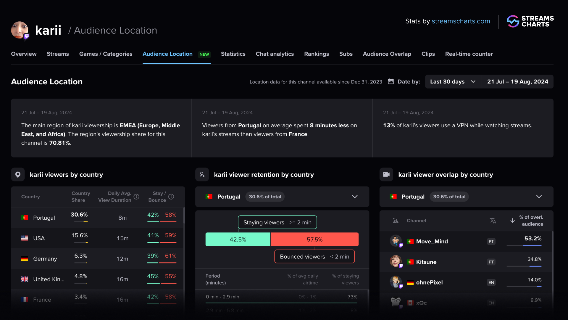 As estratégias de conteúdo da Kitsune e da karii têm as suas próprias vantagens. Por exemplo, a audiência da Kitsune é quase “puramente” portuguesa, sem utilizadores de VPN, ao contrário do MoveMind, onde 1 em cada 10 espectadores utiliza uma VPN. Entretanto, a karii transmite em inglês, o que alarga a sua audiência: enquanto mais de 90% dos espectadores do MoveMind e da Kitsune são portugueses, apenas 30% dos espectadores da karii o são, sendo 15% provenientes dos EUA. Curiosamente, a sua taxa de retenção com a audiência dos EUA é comparável à do conteúdo de jogos do MoveMind, indicando que este tipo de conteúdo ressoa mais com os seus espectadores dos EUA do que com a sua audiência portuguesa.“