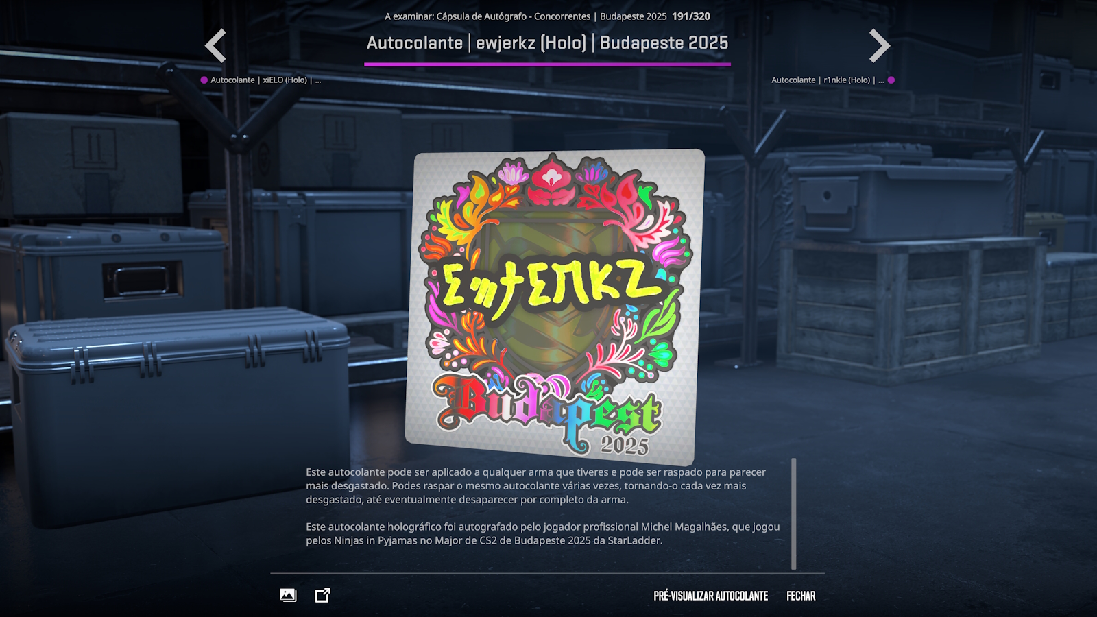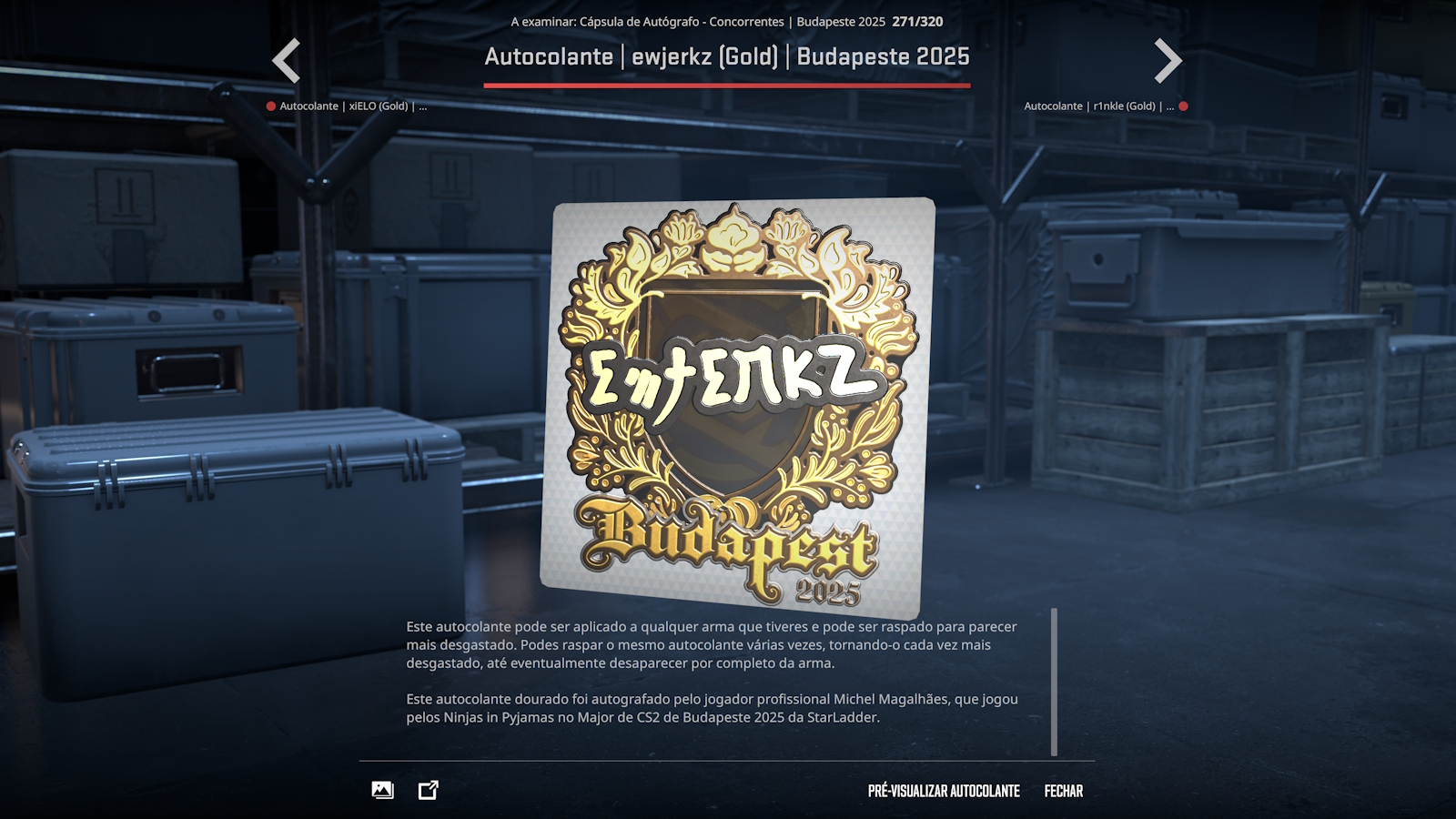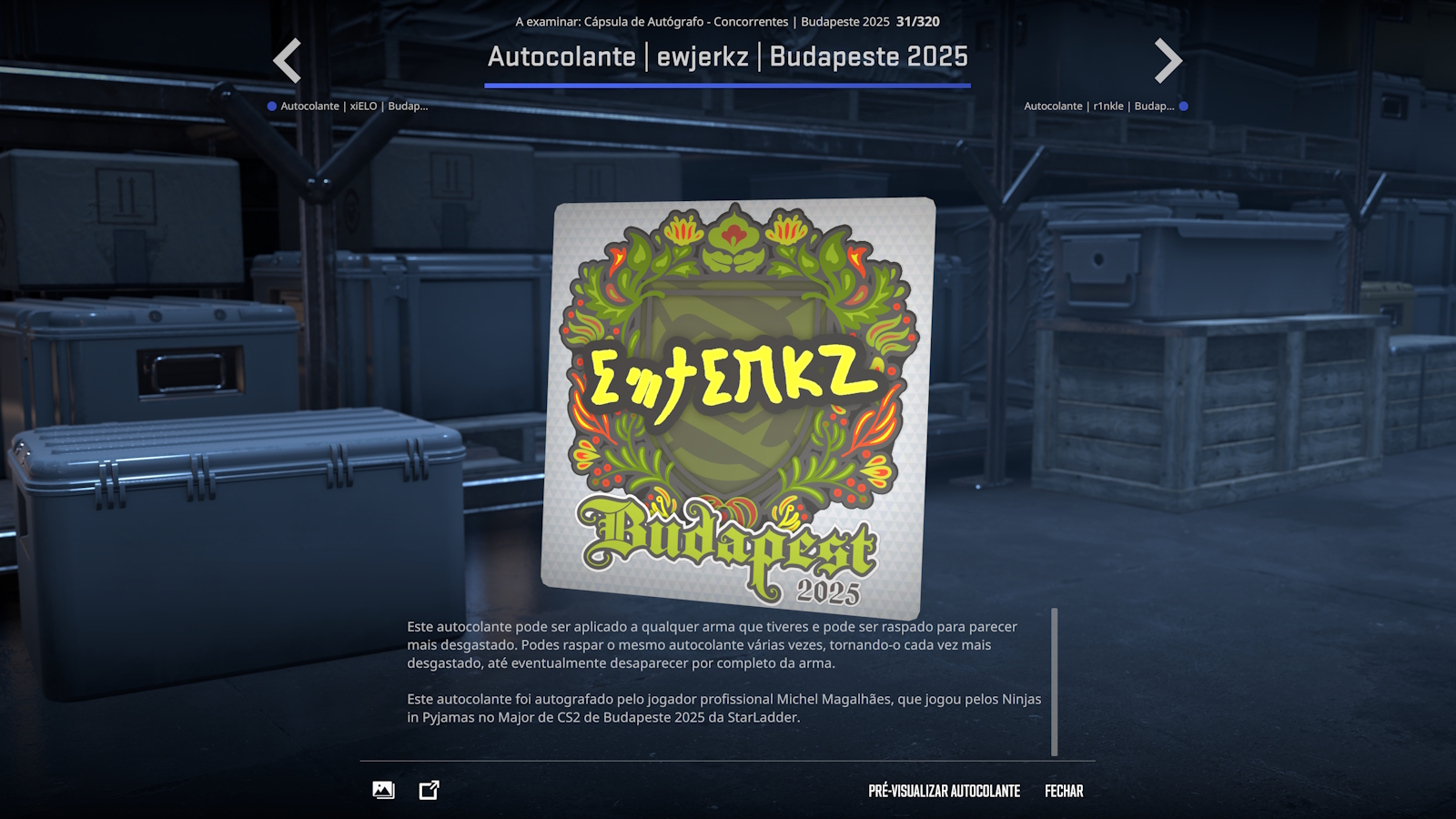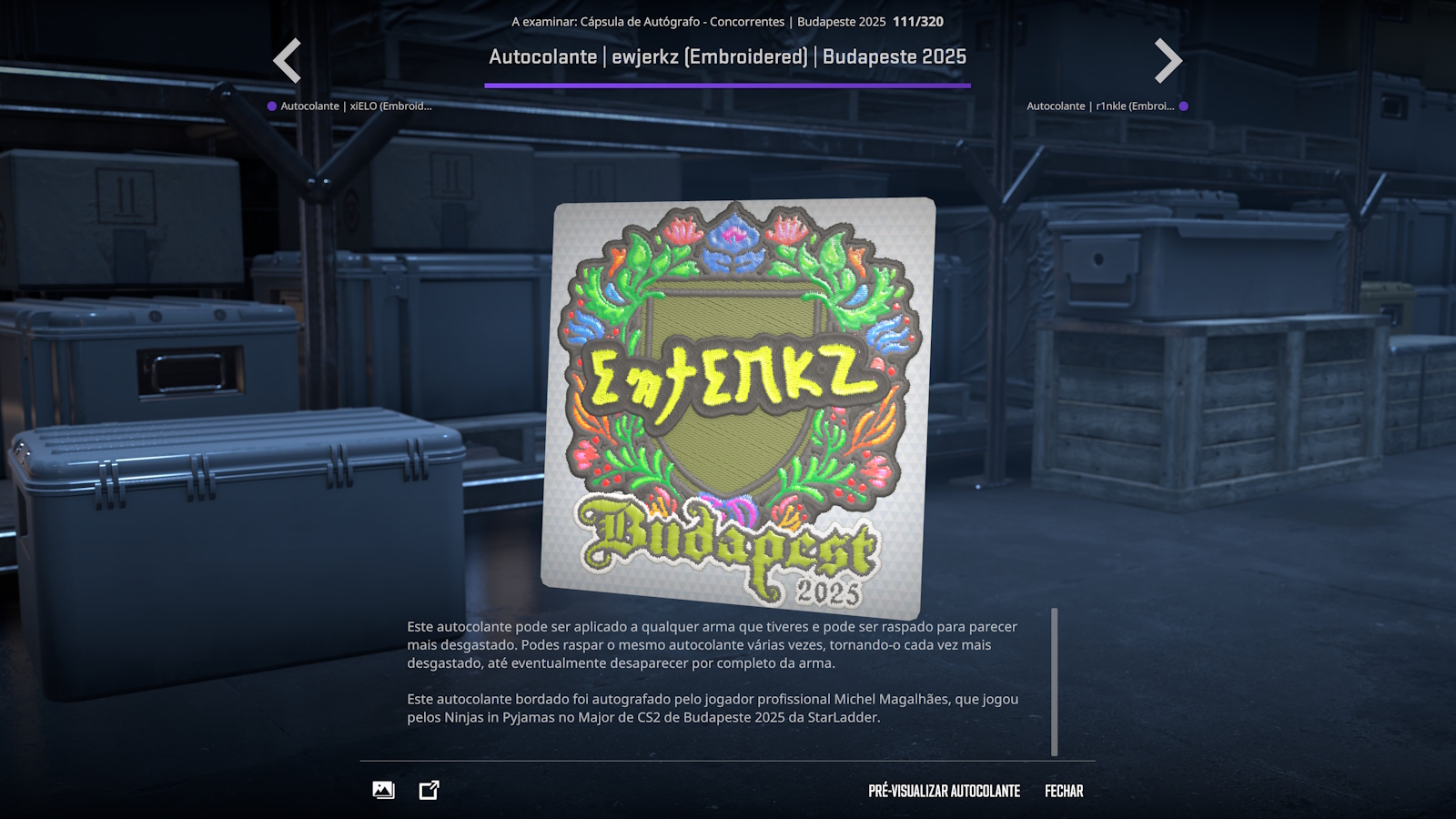 Base, Embroidered, Holo e Gold são as quatro versões em que o sticker de ewjerkz surge no jogo, a segunda delas em estreia absoluta. A primeira partida de Michel em Budapeste será já no dia 24 em duelo contra a NRG, jogo a contar para a Stage 1.
