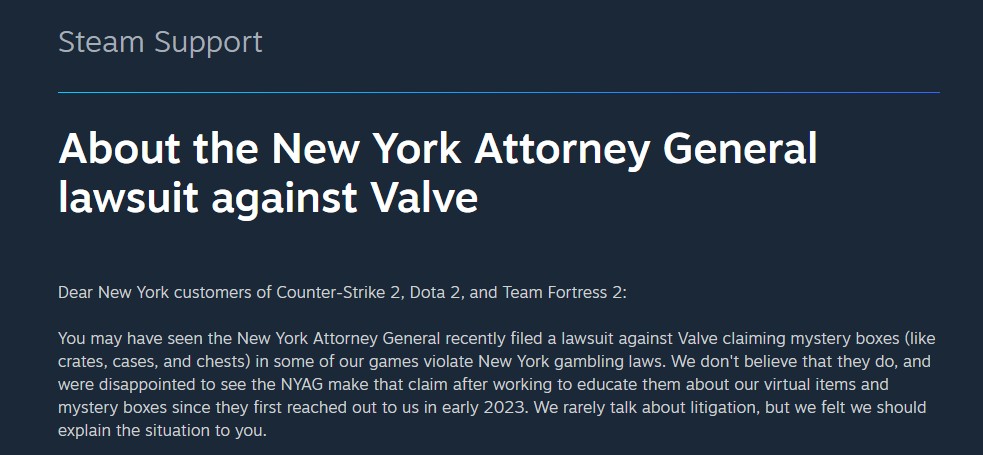 A Valve emitiu um comunicado oficial em resposta ao processo judicial movido pela Procuradoria-Geral de Nova Iorque (NYAG).